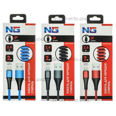 NG Кабель для зарядки Спираль iP, 2 м, 2.4А, быстрая зарядка, 3 цвета |