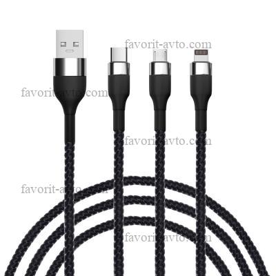 BY Кабель для зарядки 3 в 1 iP/Micro USB/Type-C, 1.5м, 2.1А, тканевая оплётка, металлик, черный |