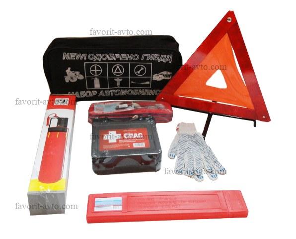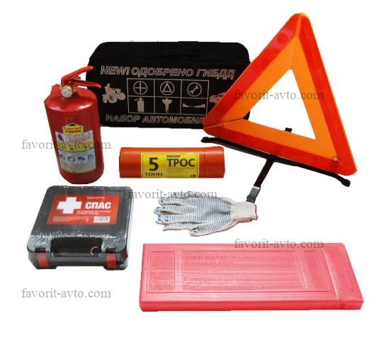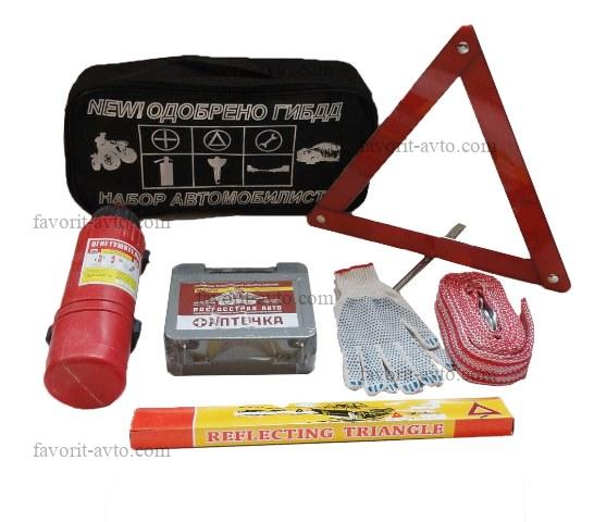 Набор автомобилиста / СТАНДАРТ /. Сумка, знак авар. остановки в пластиковом футляре, аптечка СПАС 2026г, огнетушитель 2л в картонной коробке, трос 5т. |